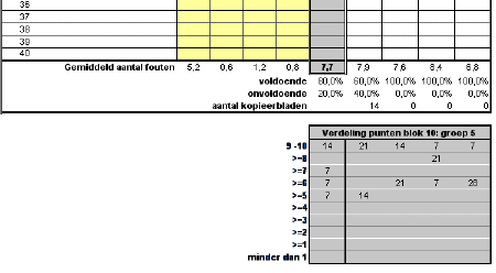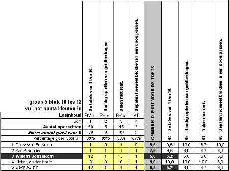 In het lichtgele gedeelte voert u het aantal fout in. In de grijze kolom ziet u de uitslag van de totale toets. Het is een gemiddelde van de gemaakte somsoorten. Rechts naast het gemiddelde staan de scores per toetsonderdeel. onvoldoende valt meteen opWanneer een leerling op een onderdeel lager dan een 6 scoort, dan wordt het betreffende vakje automatisch donkergekleurd. Wanneer een leerling lager dan een 6 scoort op de hele toets, dan wordt ook zijn naam donker gekleurd. U ziet in één oogopslag welke kinderen aandacht nodig hebben. rekening houden met aantal sommen"Pluspunt Registratie" houdt vanzelf rekening met de verschillende aantallen per somsoort. Wanneer leerlingen (zoals in bovenstaand voorbeeld) 50 sommen moeten maken, dan hoeft een leerling die 12 fouten heeft, niet meteen een onvoldoende te hebben voor de hele toets. Kijkt u maar eens naar "Willem Beuzekom" en Daya Austin". klassentotalen en kopieerbladenOnderaan het registratieblad krijgt u automatisch een totaaloverzicht. U kunt aan de hand van deze uitslagen bepalen of u misschien een bepaalde somsoort voor de hele klas of voor een kleine groep kinderen extra moet uitleggen. Ook ziet u meteen hoeveel kopieerbladen u voor de groep nodig heeft.